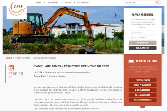 Fermeture définitive du CERF Auvergne-Rhône-Alpes Après plus de 10 années d’existence, le Centre d’Échanges et de Ressources Foncières Auvergne-Rhône-Alpes tire sa révérence. Pôle de compétence dédié à l’aménagement et au foncier créé à l’initiative du Conseil Régional AURA, le CERF a contribué au développement d’une véritable ingénierie foncière régionale en offrant un cadre d’échanges basés…